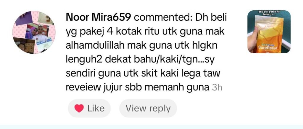 “Kali kedua beli SureRelief ni sebab memang berkesan”